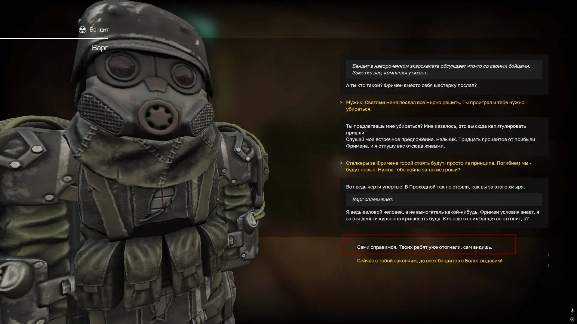 Разобравшись с бандитами, снова идём к Светлому. Теперь он предлагает решить конфликт с Варгом мирным путём. Встреча назначается на нейтральной территории.