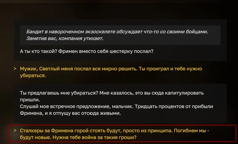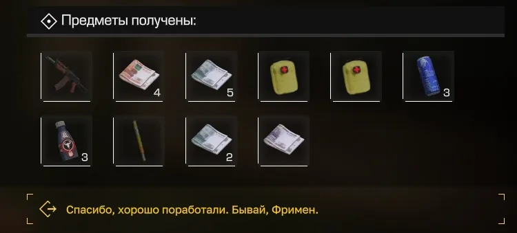 Награда напрямую зависит от выбранного варианта. Если выбрать мирные реплики (см. скриншоты), то вы получите Тактический АКС-74У с улучшенными обвесами и избежите боя. После переговоров возвращаемся к Фримену за наградой.