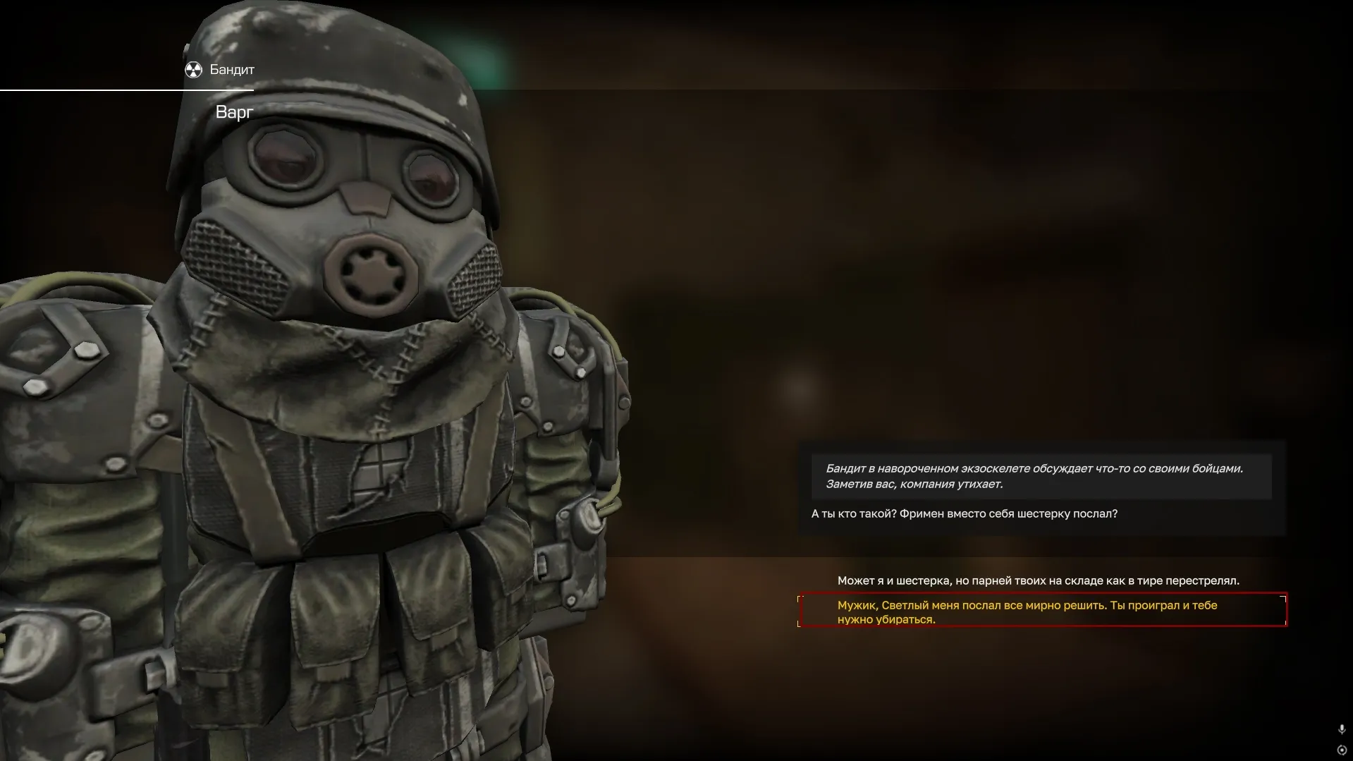 Если же предпочесть агрессивные ответы и спровоцировать Варга, то начнётся перестрелка, в которой вы убьёте его. В этом случае наградой станет Кустарный АКС-74У. Остальная часть награды останется без изменений.