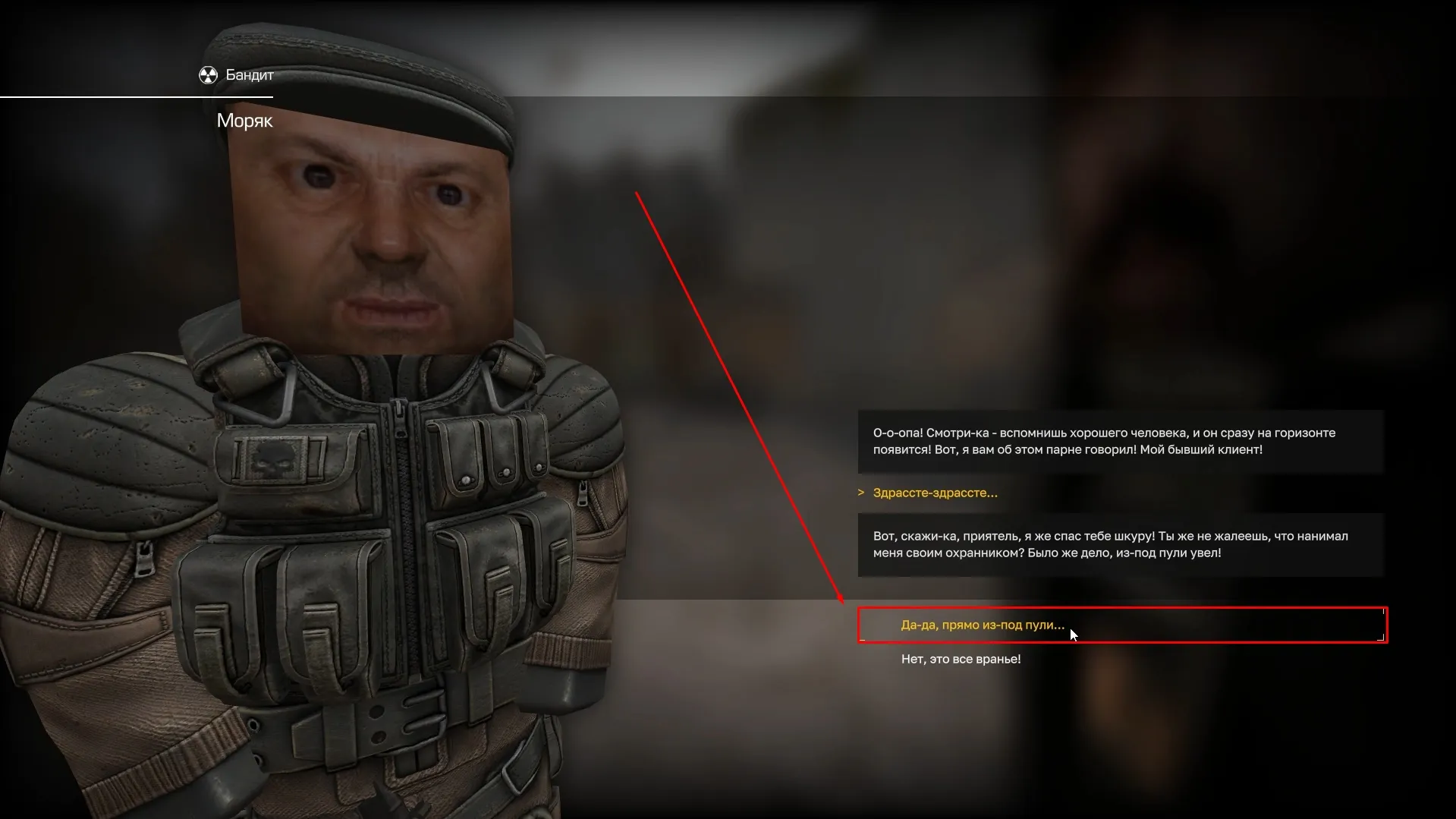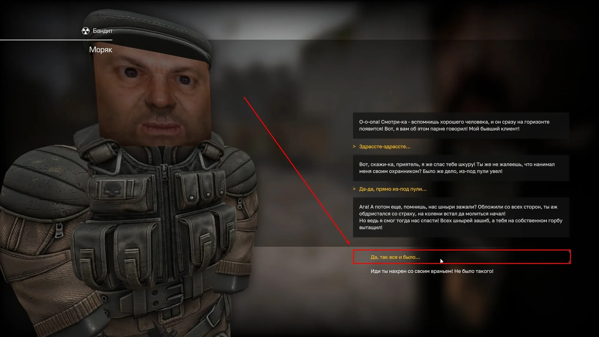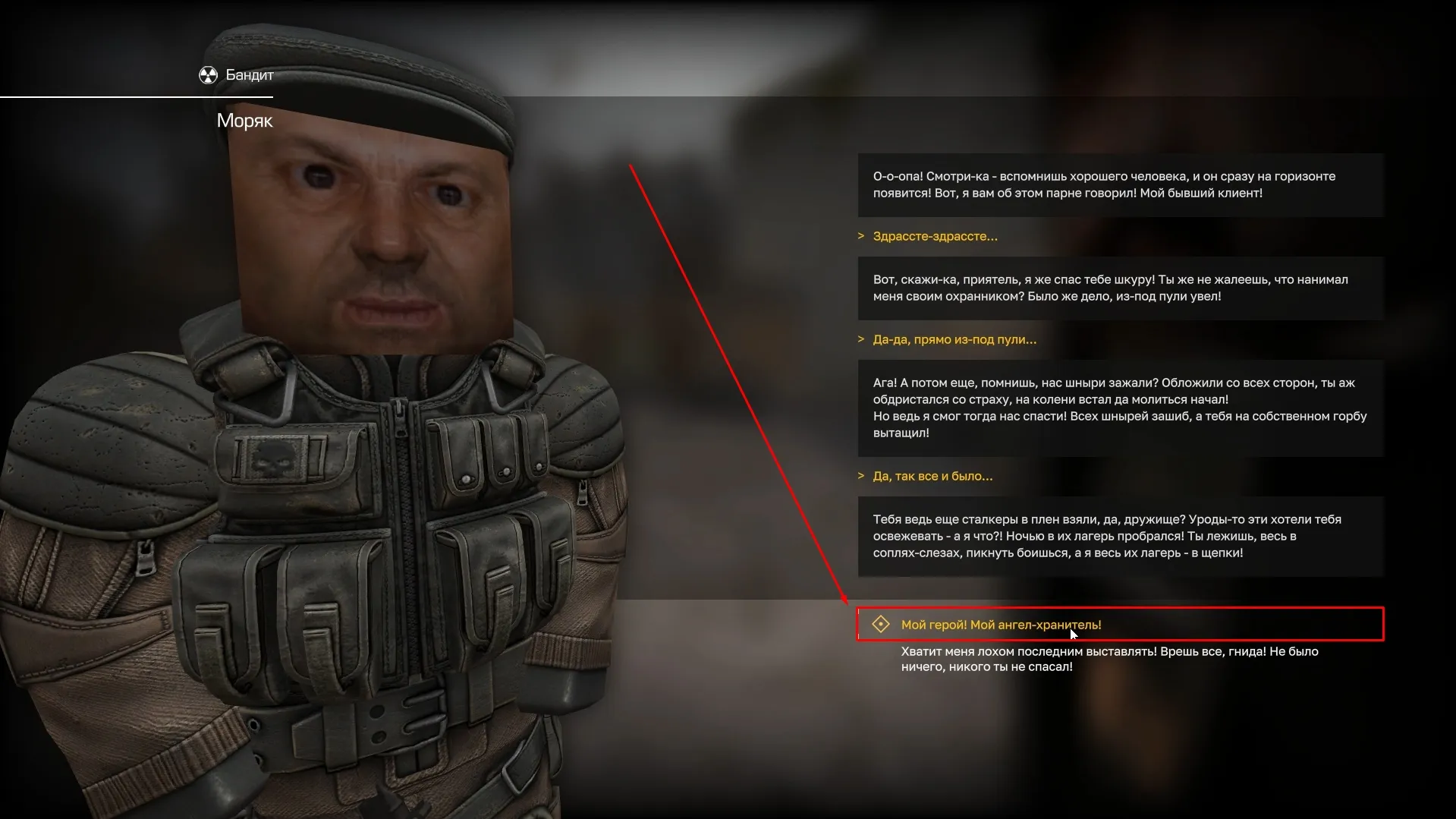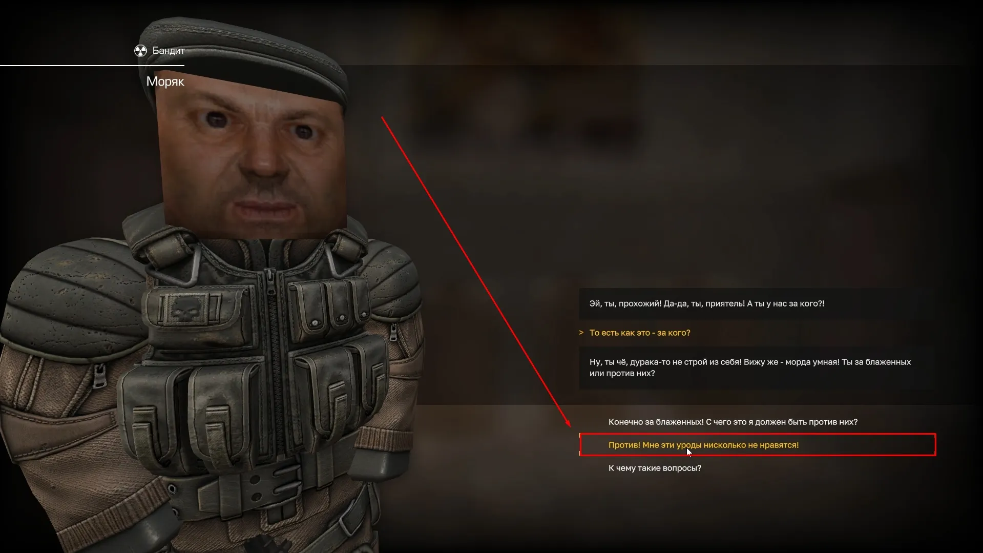 Бандит с Обочины Моряк хочет устроить гоп-стоп одному из блаженных. Нам нужно принести ему царскую водку, но для начала выберите правильные диалоги при встрече.