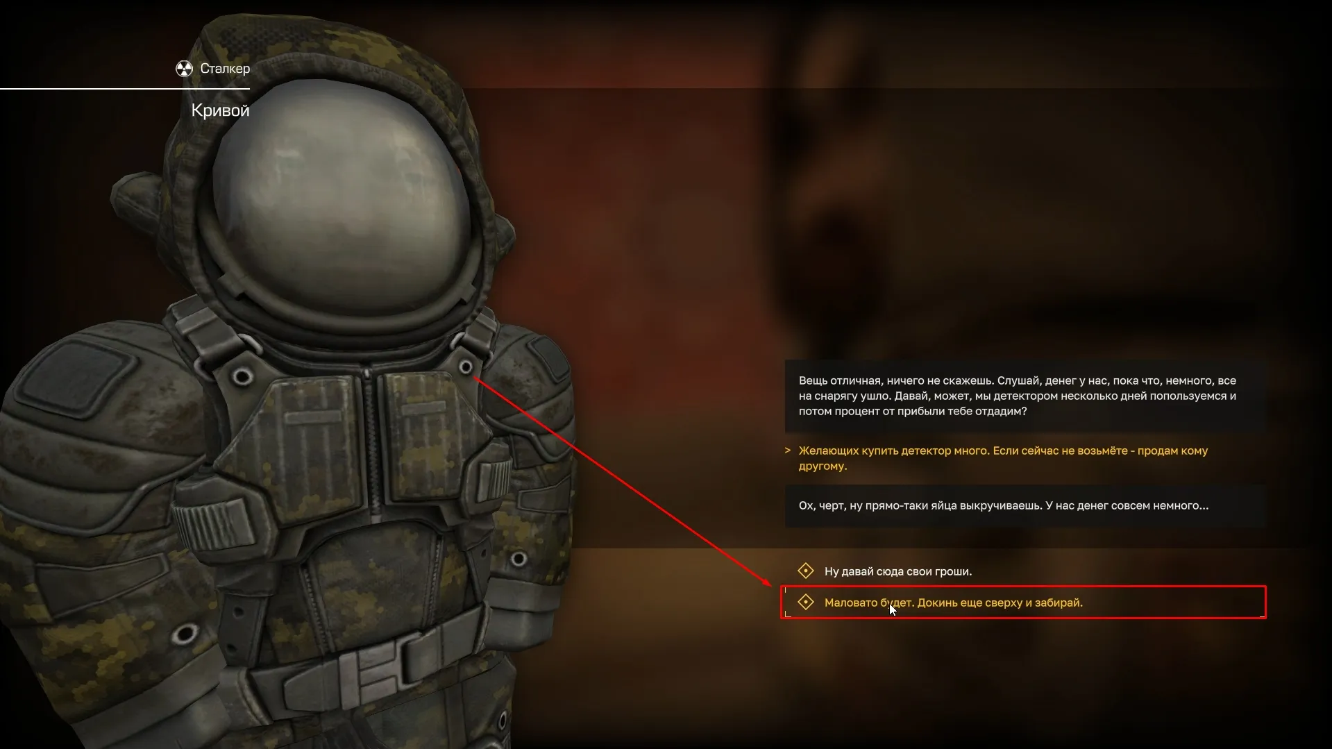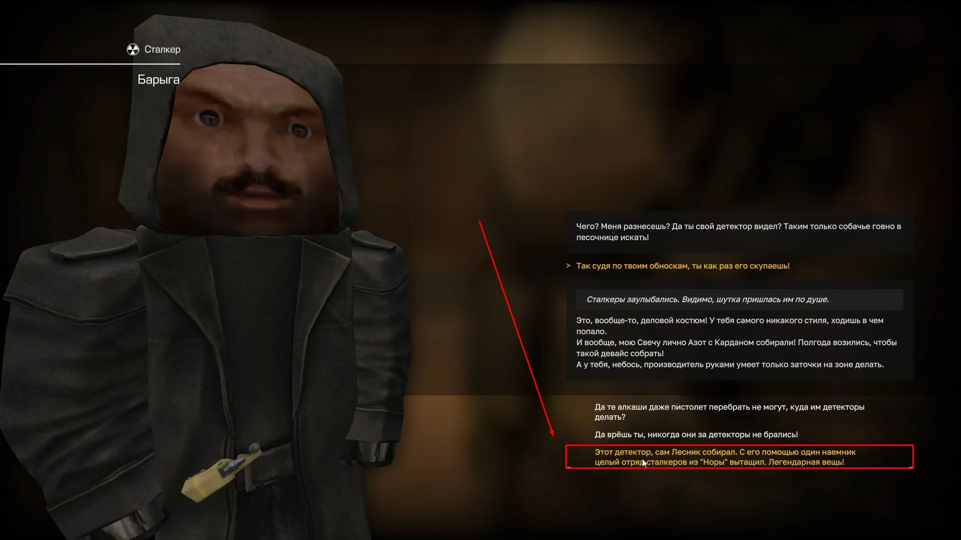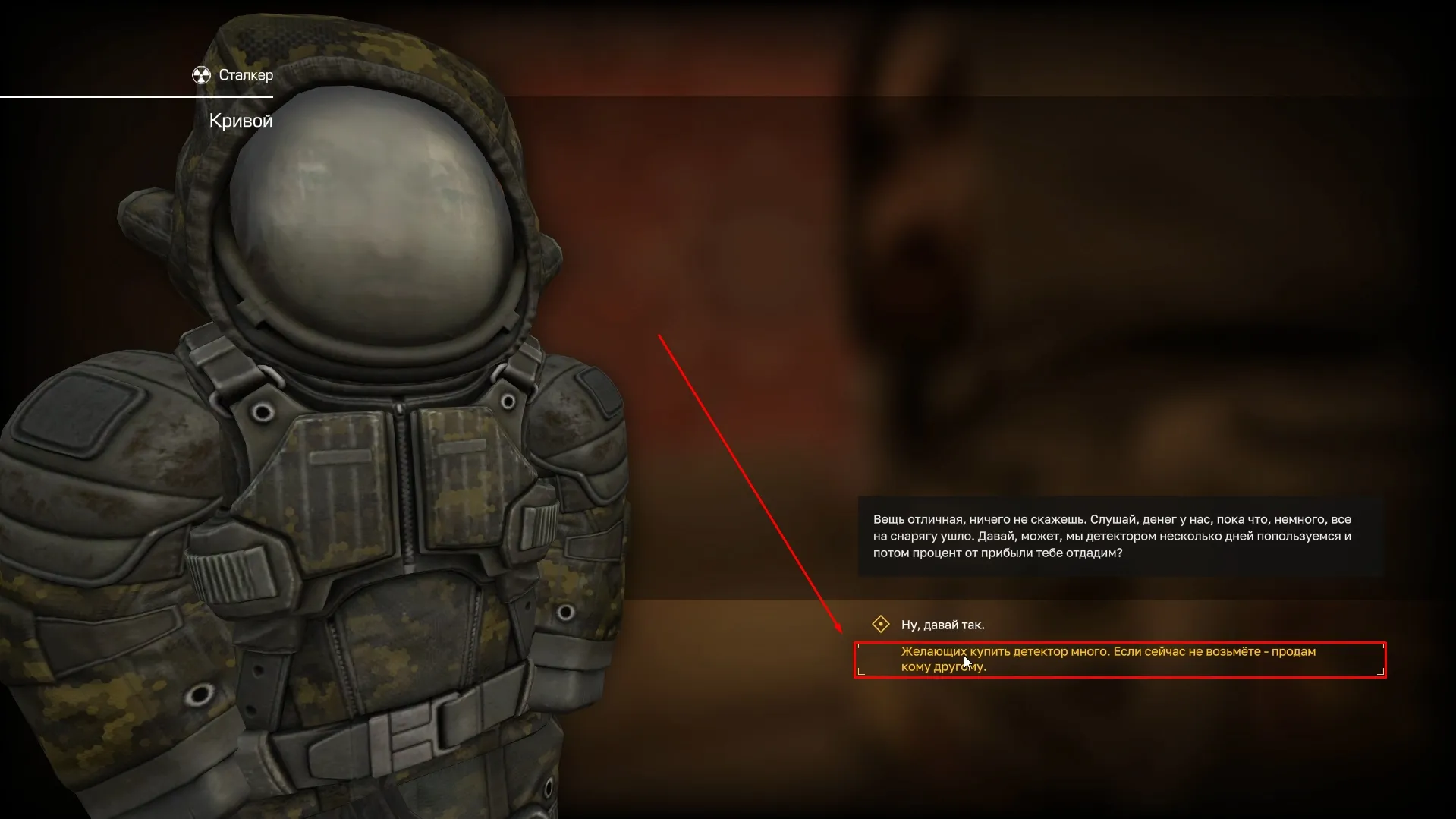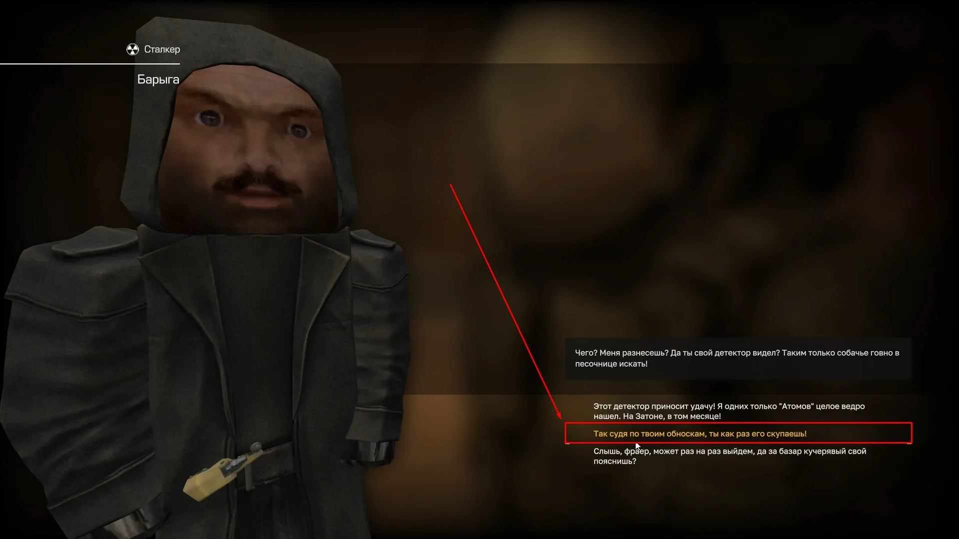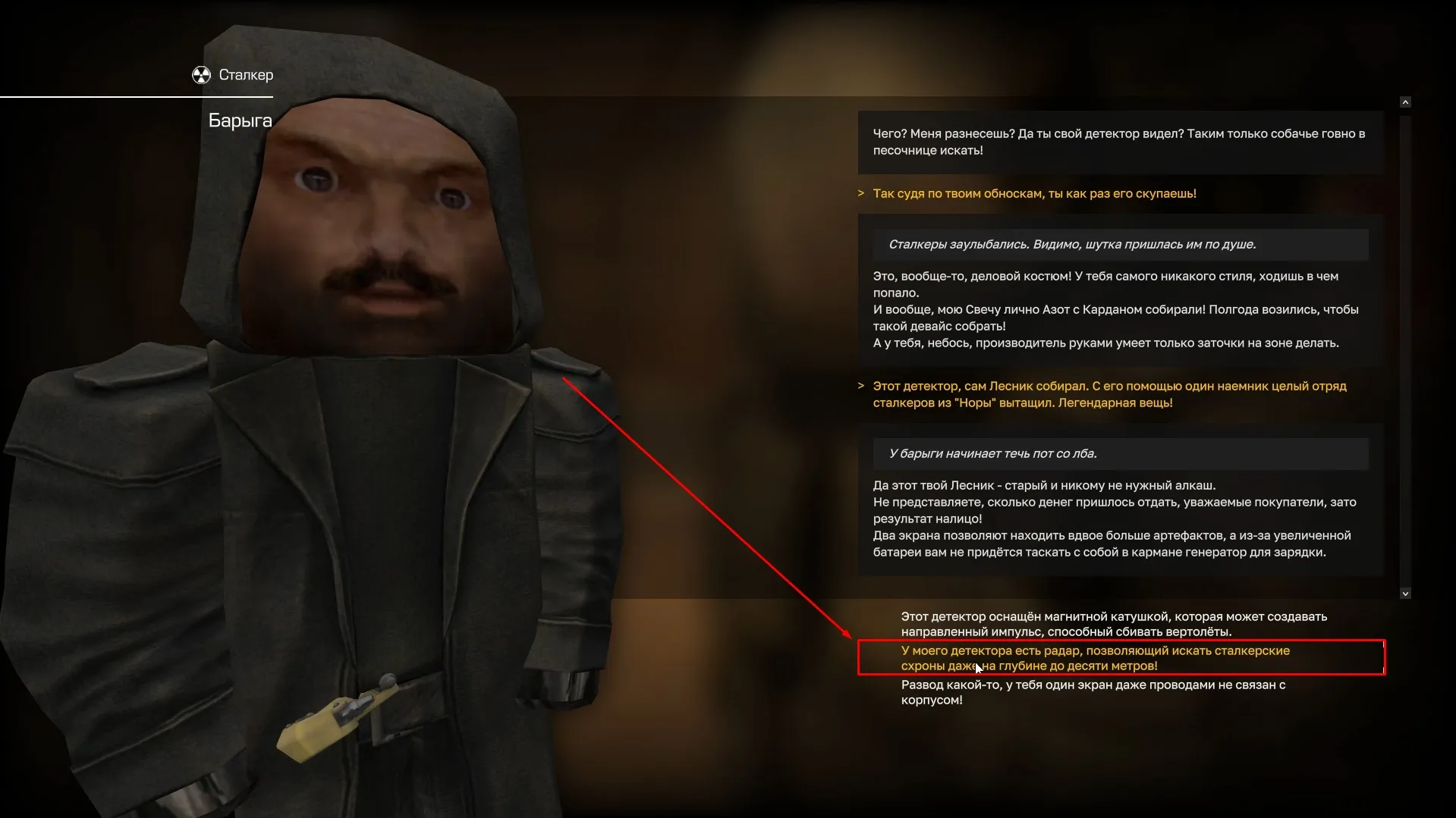 Начинаем спор с другим барыгой. — Так судя по обноскам, ты как раз его скупаешь! — Этот детектор сам Лесник собирал. С его помощью один наемник целый отряд сталкеров из «Норы» вытащил. Легендарная вещь! — У моего детектора есть радар, позволяющий искать сталкерские схроны даже на глубине до десяти метров! Разговариваем с покупателями. — Желающих купить детектор много. Если сейчас не возьмете - продам кому-нибудь другому. — Маловато будет. Докинь еще сверху и забирай.