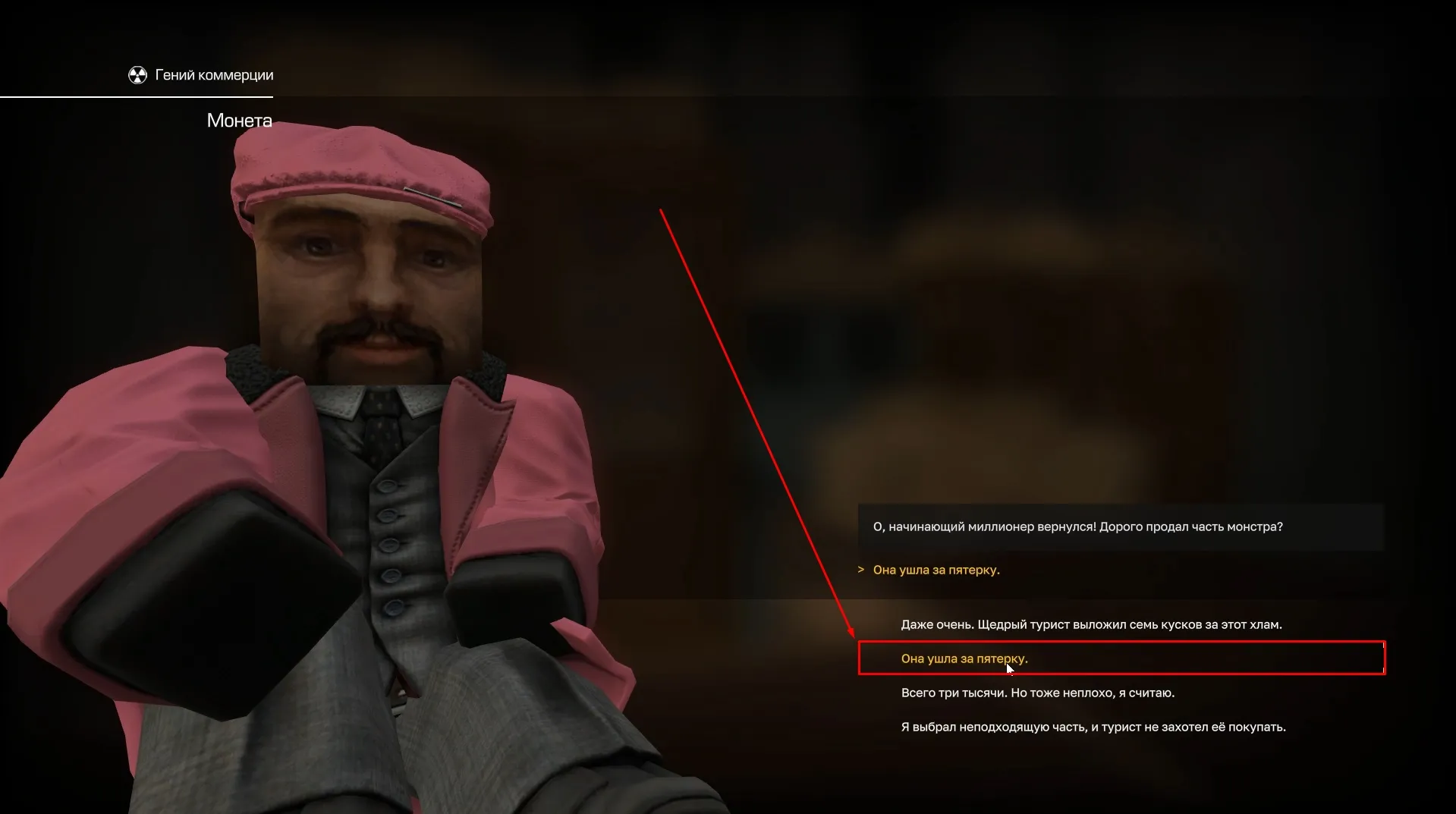 Получив награду, возвращаемся к Монете. Он спрашивает, за сколько мы продали предмет — врём, что за пять тысяч.