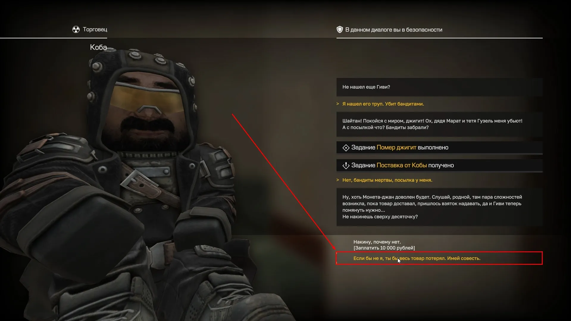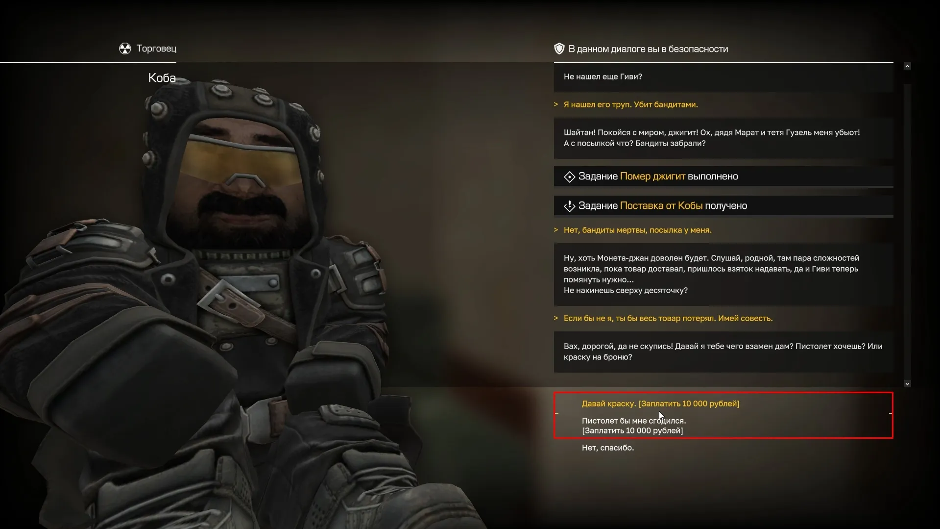 Вернувшись к Кобе, он требует 10.000 рублей. Мы отказываемся, но он снова предлагает заплатить те же деньги, только уже за пистолет или краску. В крайнем случае можно и вовсе отказаться.