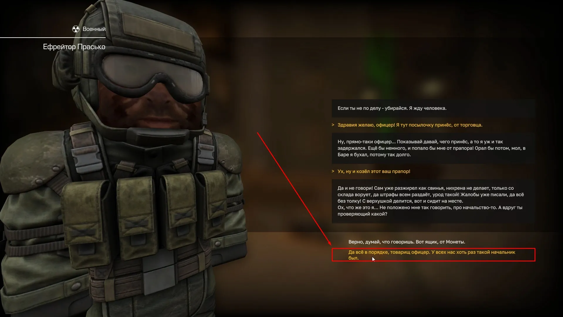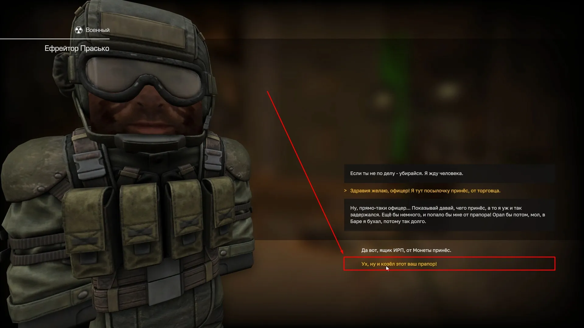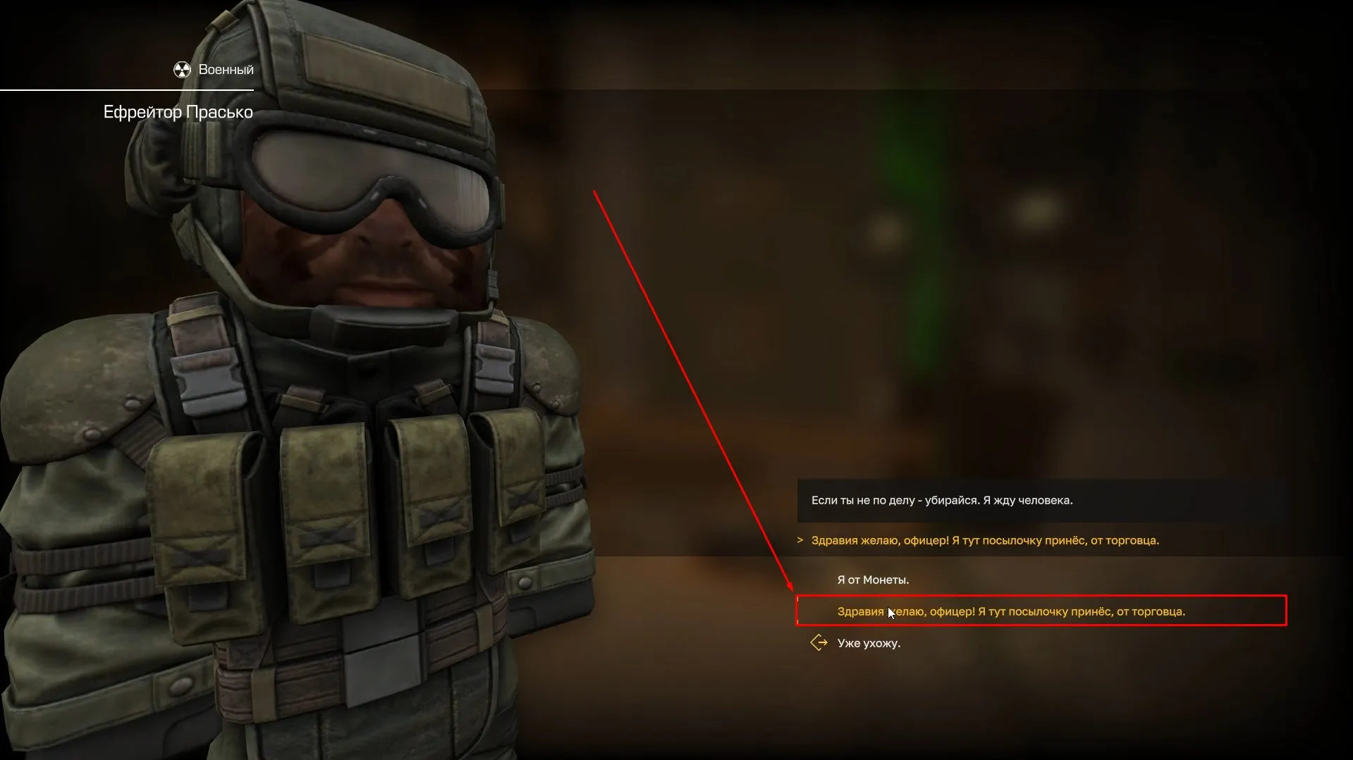 Монета, местный торговец, с хвастовством заявляет, что он гений в сфере заработка, и дает нам первое поручение — продать просроченный ИРП военным в Баре.