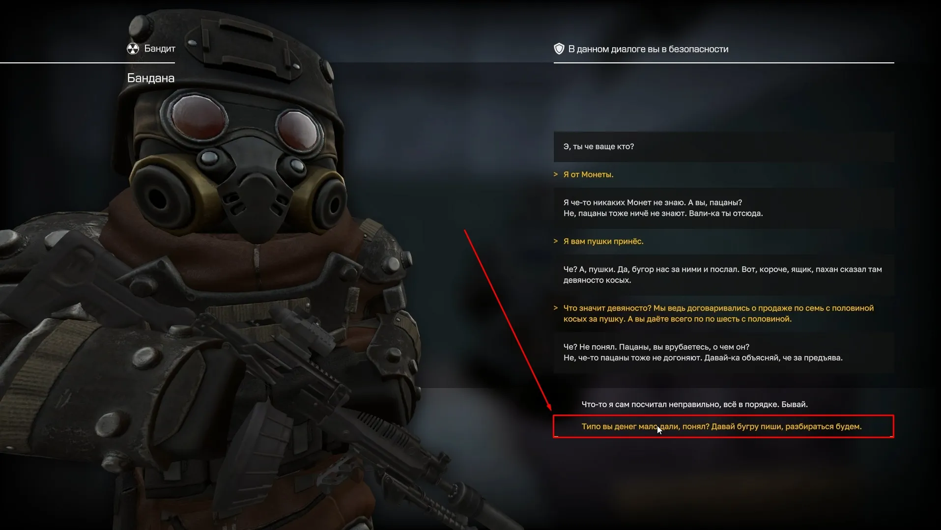 Бандиты, которым мы продали паленое оружие, напали и убили охрану Монеты. Мы предлагаем торговцу надежную защиту в лице Чешира, и он с радостью соглашается, отправляя бойцов под его руководство.