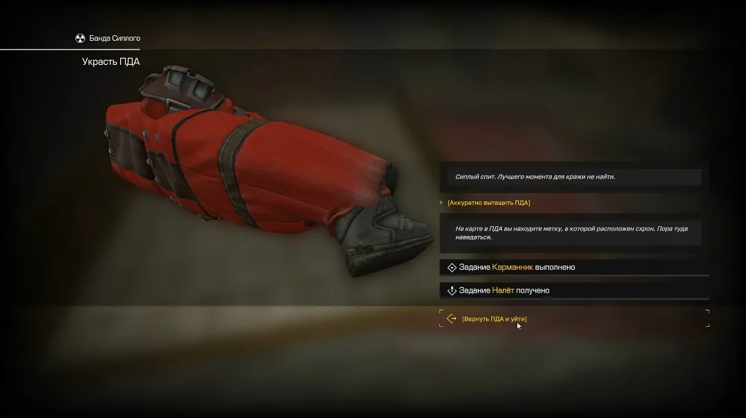 После перехода на сторону Чешира, он сообщит, что у Сиплого где-то есть общак и нужно его снести. Идем к Сиплому, чтобы обнести его и найти ПДА с меткой схрона.
