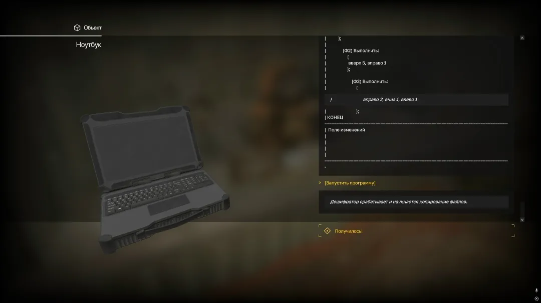 Исследователь сообщает, что найденный ПДА принадлежал легендарному Бороде. Он предполагает, что у него был схрон, который можно найти, если удастся взломать устройство. Для этого используем ноутбук.