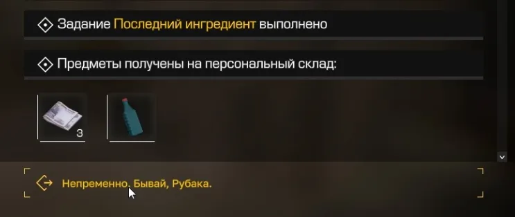 Рубака случайно отравил каких-то людей на базе и теперь его пищу никто не хочет пробовать. Он просит нас встретиться со своим старым другом Старьевщиком и попросить пожить у него, чтобы было кому готовить.