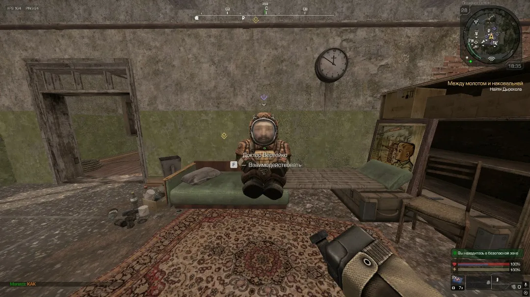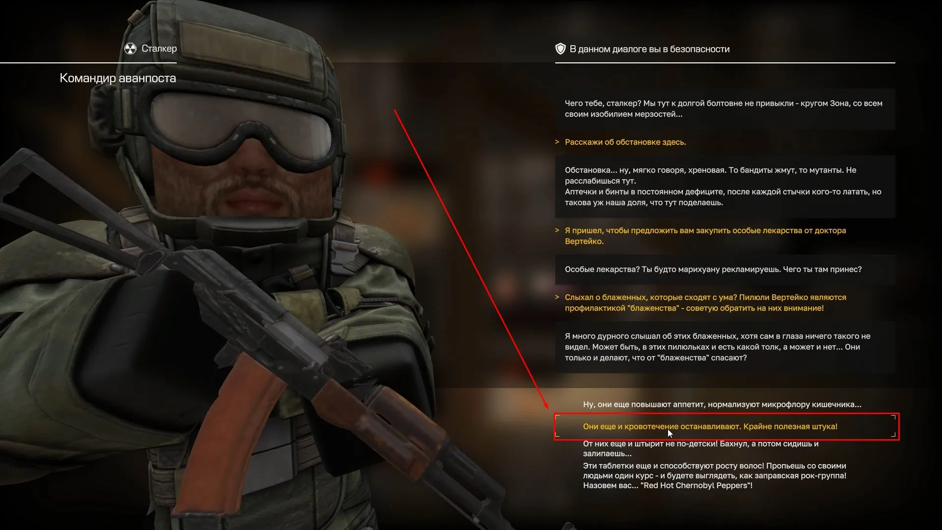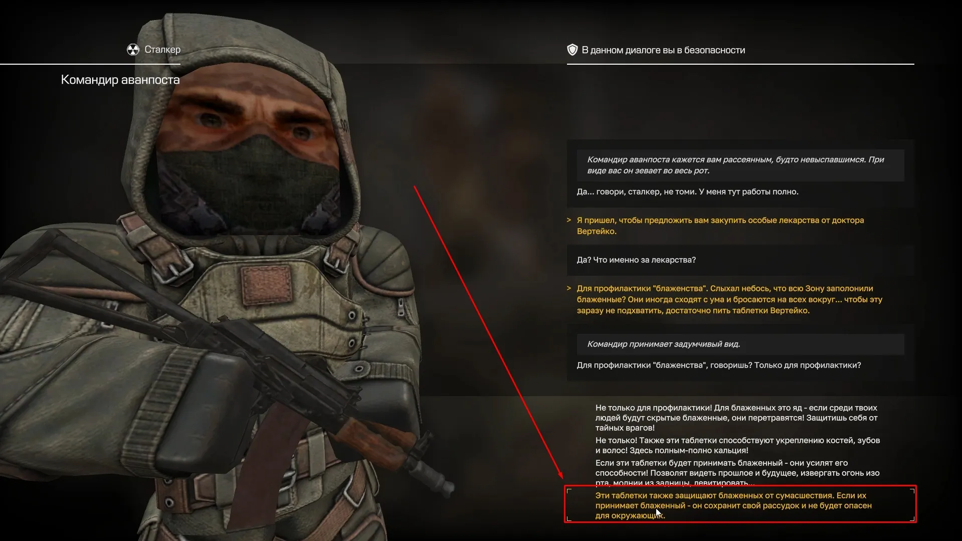 Начало квеста берется у Доктора Вертейко, который сидит на втором этаже Пожарной части. Вертейко просит нас убедить сталкеров купить его шарлатанские таблетки от блаженства. Мы соглашаемся ему помочь и отправляемся на метки.
