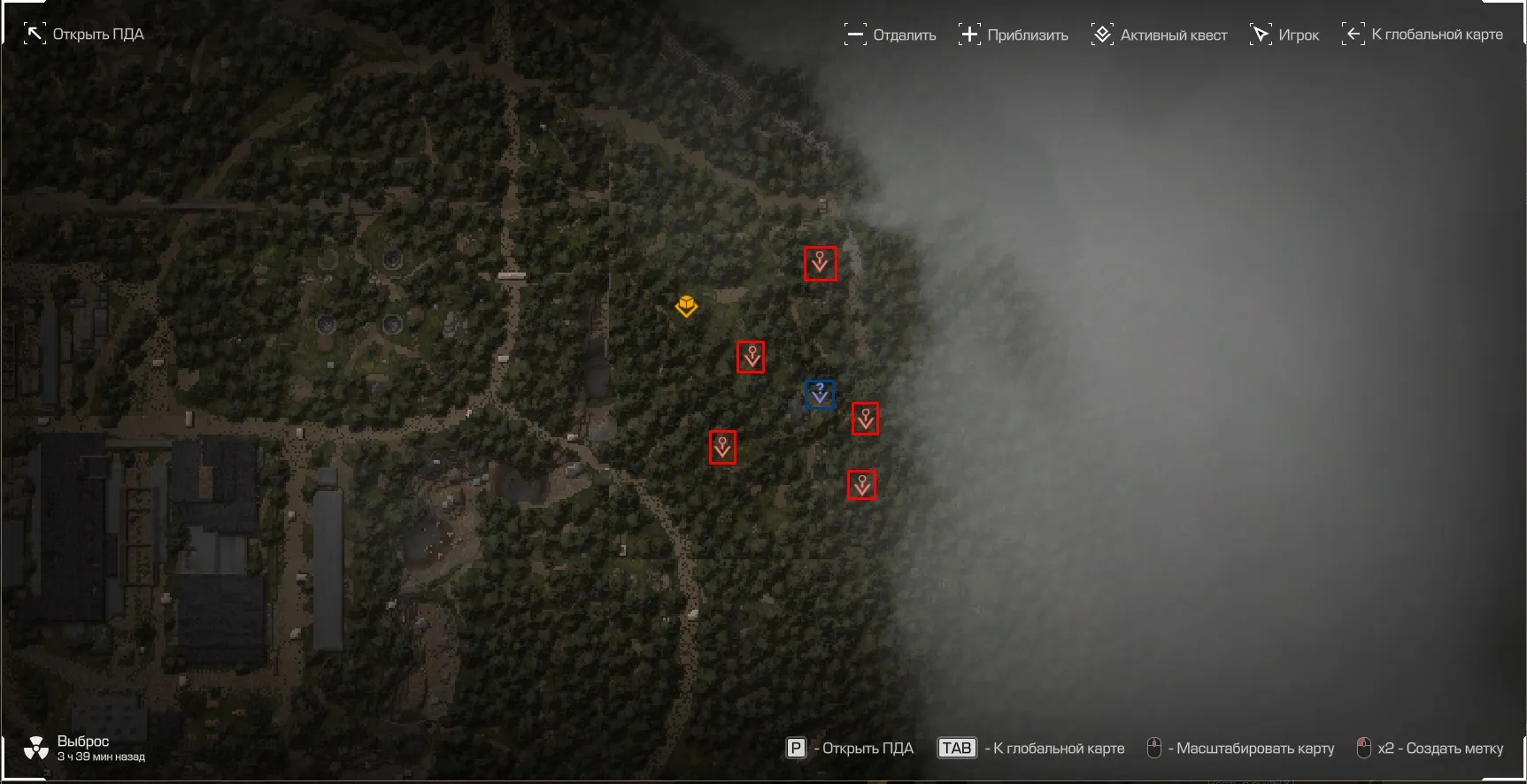 🔴 Красные метки — Поваленные деревья. 🔵 Синяя метка — Сарай с топором.